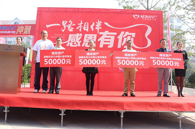 多年來建發房產一直把慈善事當成當成一項重要的工作,“建發房產慈善基金”在助學、助困、助孤上都在傳播著“有愛就有路”的理念。在企業做大做強的同時,積極回饋社會,投身公益的使命和行動沒有止步,繼去年向永安六中捐贈20萬助學金,今年建發房產三明事業部將繼續向永安六中、永安三中、永安實驗小學、永安巴溪灣小學四所學校總額捐贈助學金20萬,活動當天分別向四所學校代表人,舉行了捐贈儀式。現場許多來賓及業主也為建發房產的善舉表示肯定和贊賞。正如永安六中校長許有濤先生說:“建發房產的善舉,也許對企業來講是一個很小的行為,但是對于那些需要幫助人們卻是一件很大事。也許正是這么一個小小的善舉,改變一個人、一生的命運”。
